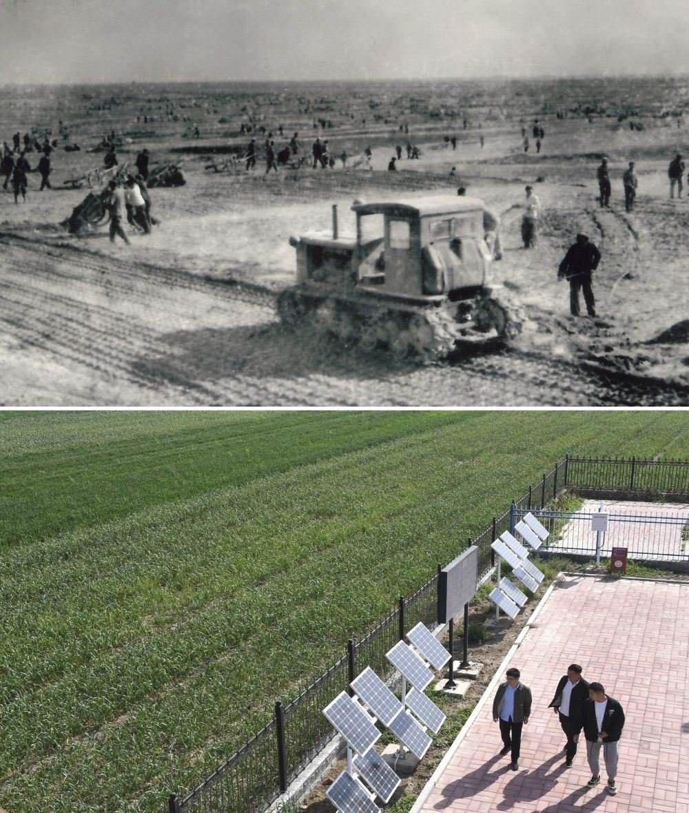 拼版照片:上圖為二十世紀(jì)六十年代蘭考改造鹽堿地的情景(資料照片);下圖為2024年4月18日拍攝的蘭考縣紅廟鎮(zhèn)高標(biāo)準(zhǔn)農(nóng)田示范區(qū)(新華社記者朱祥攝)。新華社發(fā)