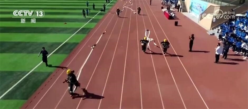 發(fā)令員一聲哨響,幾名消防員手持水槍水帶,飛快向前沖出。這是在山東濟(jì)寧某中學(xué)舉行的首屆“消防安全運動會”上,消防員模擬救援現(xiàn)場進(jìn)行的四百米五帶三槍操法展示。