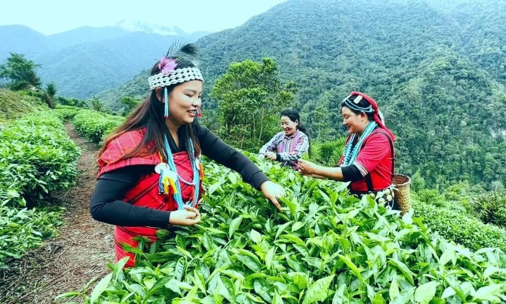茶廠里人頭攢動(dòng)、歡聲笑語(yǔ),珞巴族女子穿梭在茶樹(shù)之間,單手輕輕一旋,嫩葉飄然入簍,不一會(huì)兒,簍里已是一片青綠。