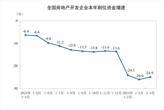 1—4月份,房地產(chǎn)開發(fā)企業(yè)到位資金34036億元,同比下降24.9%。其中,國內(nèi)貸款5583億元,下降10.1%;利用外資9億元,下降46.7%;自籌資金11736億元,下降10.1%;定金及預(yù)收款10002億元,下降37.2%;個(gè)人按揭貸款4953億元,下降39.7%。