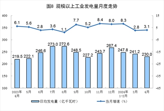 分品種看,4月份,規(guī)上工業(yè)火電、水電、太陽(yáng)能發(fā)電增速加快,核電由降轉(zhuǎn)增,風(fēng)電同比下降。其中,規(guī)上工業(yè)火電同比增長(zhǎng)1.3%,增速比3月份加快0.8個(gè)百分點(diǎn);規(guī)上工業(yè)水電增長(zhǎng)21.0%,增速比3月份加快17.9個(gè)百分點(diǎn);規(guī)上工業(yè)核電增長(zhǎng)5.9%,3月份為下降4.8%;規(guī)上工業(yè)風(fēng)電下降8.4%,3月份為增長(zhǎng)16.8%;規(guī)上工業(yè)太陽(yáng)能發(fā)電增長(zhǎng)21.4%,增速比3月份加快5.6個(gè)百分點(diǎn)。