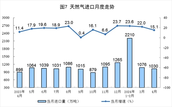 1—4月份,規(guī)上工業(yè)天然氣產(chǎn)量830億立方米,同比增長(zhǎng)5.0%。進(jìn)口天然氣4300萬(wàn)噸,同比增長(zhǎng)20.7%。