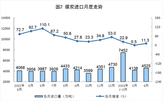 原煤生產(chǎn)降幅收窄,進(jìn)口明顯回升。4月份,規(guī)上工業(yè)原煤產(chǎn)量3.7億噸,同比下降2.9%,降幅比3月份收窄1.3個(gè)百分點(diǎn);日均產(chǎn)量1239萬(wàn)噸。進(jìn)口煤炭4525萬(wàn)噸,同比增長(zhǎng)11.3%。