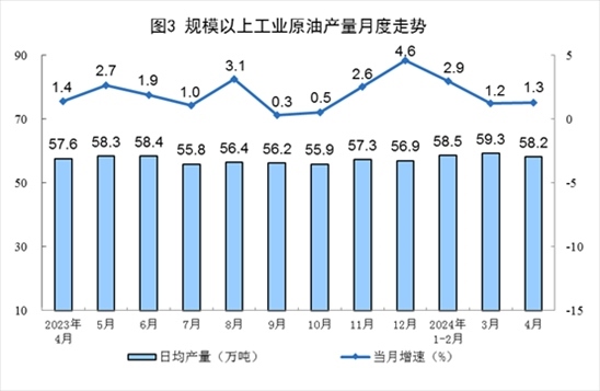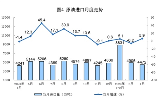 原油生產(chǎn)平穩(wěn)增長(zhǎng),進(jìn)口由降轉(zhuǎn)增。4月份,規(guī)上工業(yè)原油產(chǎn)量1747萬(wàn)噸,同比增長(zhǎng)1.3%,增速比3月份加快0.1個(gè)百分點(diǎn);日均產(chǎn)量58.2萬(wàn)噸。進(jìn)口原油4472萬(wàn)噸,同比增長(zhǎng)5.9%。