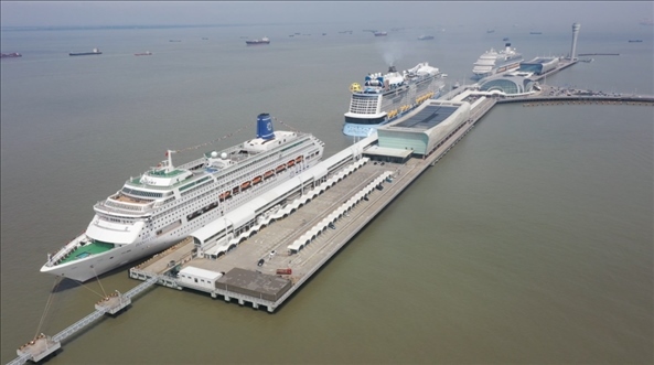 5月22日,“愛(ài)達(dá)·魔都號(hào)”“海洋光譜號(hào)”和“鼓浪嶼號(hào)”三艘郵輪停靠在吳淞口國(guó)際郵輪港(無(wú)人機(jī)照片)。(上海邊檢總站供圖)