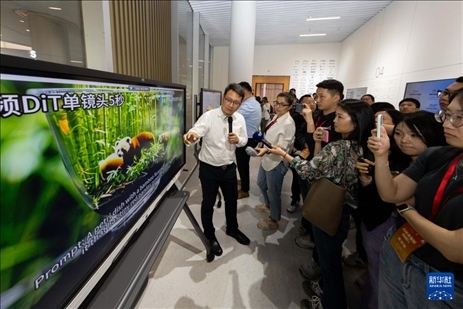 ?5月23日,大模型企業(yè)、智象未來(lái)生態(tài)合作部總經(jīng)理沈偉峰為采訪團(tuán)介紹運(yùn)用大模型文生視頻。新華社記者 王翔 攝