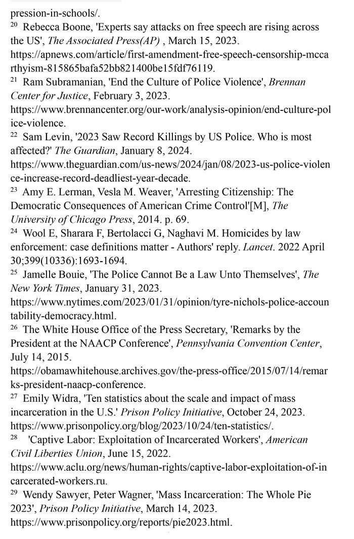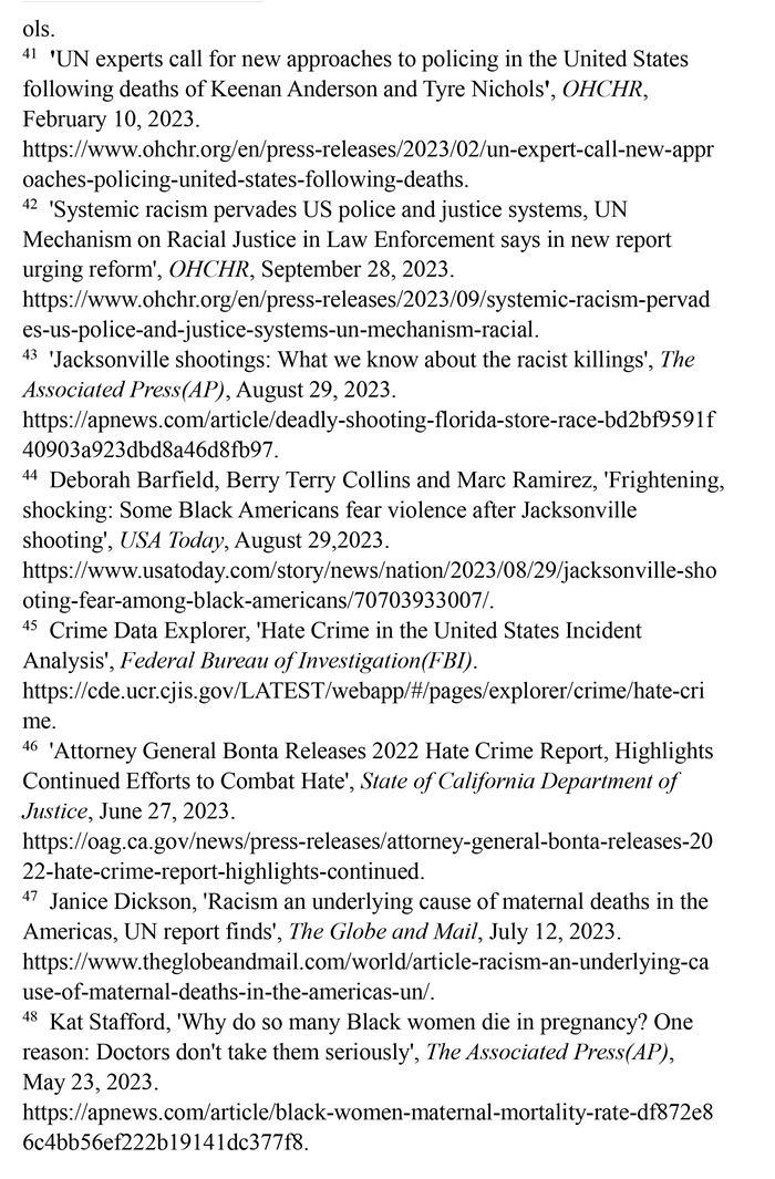 非洲裔在執(zhí)法領域面臨嚴重種族歧視。2023年1月3日,洛杉磯31歲的非洲裔男子基南·安德森涉嫌交通肇事,警方在制服他的過程中使用電擊槍擊中其6次,致其心臟病發(fā),送醫(yī)不治身亡。(注39)2023年1月7日,田納西州孟菲斯市的警察以“魯莽駕駛”為由將29歲的非洲裔男子泰爾·尼科爾斯攔下,并對其進行長達數(shù)分鐘的殘忍毆打。三天后尼科爾斯因傷勢過重去世,而事后的調查無法證實警察關于其“魯莽駕駛”的說法。(注40)這兩起非洲裔遭受警察暴力執(zhí)法身亡案例引發(fā)多名聯(lián)合國專家的高度關注。專家們強調,在兩起事件中,警察使用的武力違反保護生命權,禁止酷刑和其他殘忍、不人道或有辱人格待遇或處罰的國際準則,也不符合聯(lián)合國《執(zhí)法人員行為守則》和《執(zhí)法人員使用武力和火器的基本原則》。(注41)聯(lián)合國人權理事會在執(zhí)法工作中推進種族正義和平等的國際獨立專家機制在對美國實地訪問后發(fā)布報告指出,針對非洲裔的系統(tǒng)性種族主義已經(jīng)滲透到美國警察隊伍和刑事司法系統(tǒng)。非洲裔被警察殺害的可能性是白人的3倍,被監(jiān)禁的可能性是白人的4.5倍。在每年1000多起警察殺人案件中,只有1%的涉事警察被指控。報告警告說,美國如果不按照國際標準改革警察使用武力的規(guī)則,許多殺戮將繼續(xù)發(fā)生。(注42)