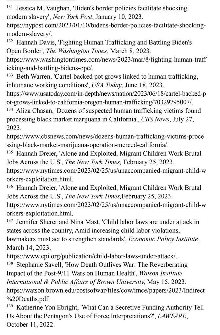 邊境政策助長現(xiàn)代奴隸制。美國政府的邊境政策加劇人口販運問題。被遺棄在邊境州城鎮(zhèn)或被運往全國各地的移民,往往處于孤立無援境地,最容易受到剝削和販運。那些非法越境后聚集在擁擠、缺乏監(jiān)管的庇護所的兒童也成為人口販子的獵物。(注131)在美國被販運的人中,72%是移民,其中大部分是通過偷渡入境,人口販運的受害者多是婦女和兒童。打擊販賣婦女聯(lián)盟的一項研究估計,60%的越境無人陪伴移民兒童被犯罪集團強迫從事兒童色情甚至販毒活動。(注132)《今日美國報》網(wǎng)站2023年6月18日報道,移民被販毒集團誘騙到加利福尼亞州北部和俄勒岡州南部的農(nóng)場從事大麻種植,遭受奴役和強迫勞動。被販賣的移民在大麻農(nóng)場遭持槍恐嚇,每天被迫工作16個小時甚至更長時間,有時連飯都吃不上。移民婦女遭到性侵犯,有些人被謀殺,尸體被丟棄在荒野中。(注133)美國哥倫比亞廣播公司新聞網(wǎng)2023年7月27日報道,近60名遭人口販運的受害者被偷運到加利福尼亞中部的一個非法大麻種植場所,被強迫加工大麻,向偷運者償還債務。(注134)