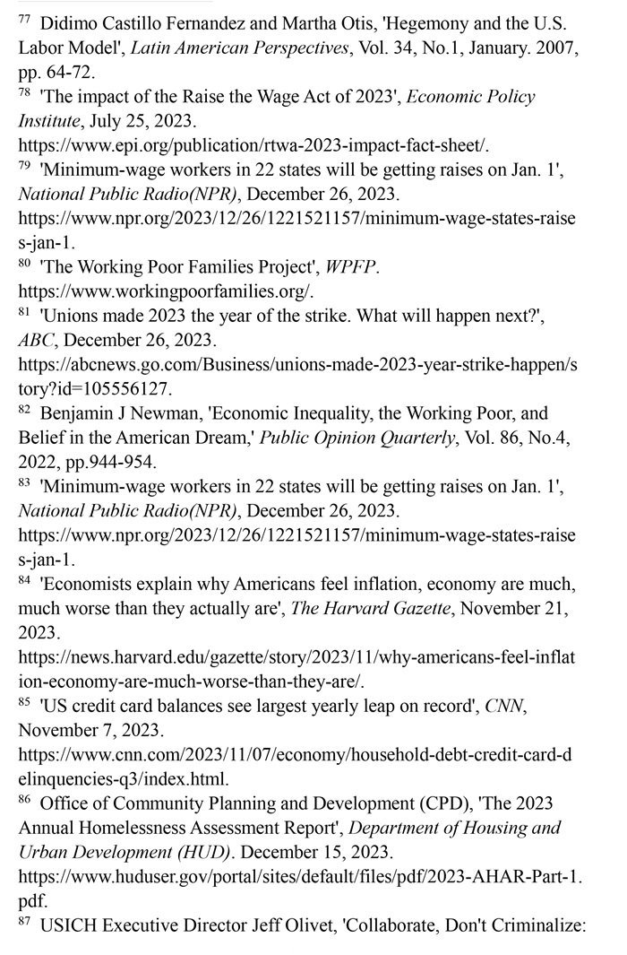 “工作者貧困”問題突出。美國勞動力市場狀況發(fā)生了結構性變化,低薪崗位和缺乏監(jiān)管普遍存在。(注77)有大批“工作窮人”終日勞作,其工資水平卻難以維持基本生計,還缺乏應有的社會保障。美國聯(lián)邦最低時薪標準自2009年以來一直沒有上調。(注78)美國勞工部的數(shù)據(jù)顯示,2023年仍有20個州維持聯(lián)邦最低時薪標準。(注79)美國有1150萬個低收入工薪家庭,包括1480萬兒童在內的2990多萬美國人生活在這些低收入工薪家庭。(注80)勞資收入增長懸殊導致多行業(yè)大面積罷工。2023年,美國發(fā)生了21世紀以來波及范圍最廣的罷工潮,包括影視、制造、醫(yī)療、媒體在內的多個行業(yè)都出現(xiàn)大規(guī)模罷工。(注81)加利福尼亞州大學公共政策與政治學院副教授本杰明·紐曼評論稱,陷入結構性貧困之中的“工作窮人”既缺乏機會平等,也難以向上流動,他們極大地降低了對“美國夢”的信念。(注82)
