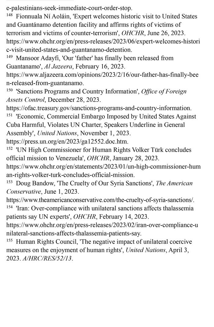長期濫施單邊制裁造成嚴重人道主義后果。自1950年以來,美國使用的制裁次數(shù)居全球之首。根據(jù)美國財政部2023年12月28日公布的數(shù)據(jù),美國制裁的國家超過20個。(注150)第78屆聯(lián)合國大會發(fā)言人2023年11月1日指出,美國對古巴實施的經(jīng)濟、商業(yè)和金融封鎖違反了《聯(lián)合國憲章》,對古巴人民造成了毀滅性影響。(注151)聯(lián)合國大會2023年11月2日通過決議,再次敦促美國終止對古巴長達60多年的經(jīng)濟、商業(yè)和金融封鎖,這是聯(lián)合國大會連續(xù)第31年通過類似決議。2023年1月28日,聯(lián)合國人權事務高級專員沃爾克·圖爾克在訪問委內瑞拉后表示,2017年以來美國施加的制裁加劇了委內瑞拉的經(jīng)濟危機,嚴重阻礙人權的實現(xiàn)。(注152)“美國保守派”網(wǎng)站2023年6月1日報道,美國制裁進一步加劇了敘利亞人民的貧困。敘利亞70%的人口面臨食物短缺,其中1200萬人三餐不繼,290萬人食不果腹。(注153)聯(lián)合國人權理事會單邊強制措施對人權負面影響問題特別報告員阿萊娜·杜晗2023年2月14日指出,美國對伊朗的制裁減少了地中海貧血癥患者從國外進口救命藥物的機會,導致伊朗患者的并發(fā)癥和死亡率增加,是對健康權的侵犯。(注154)聯(lián)合國人權理事會2023年4月3日通過決議指出,單邊強制性措施會對目標國家廣大民眾的人權產(chǎn)生深遠影響,對窮人和處境最脆弱的人影響尤為嚴重。決議譴責某些大國繼續(xù)單方面適用單邊強制性措施。美國在該決議表決中投了反對票。(注155)