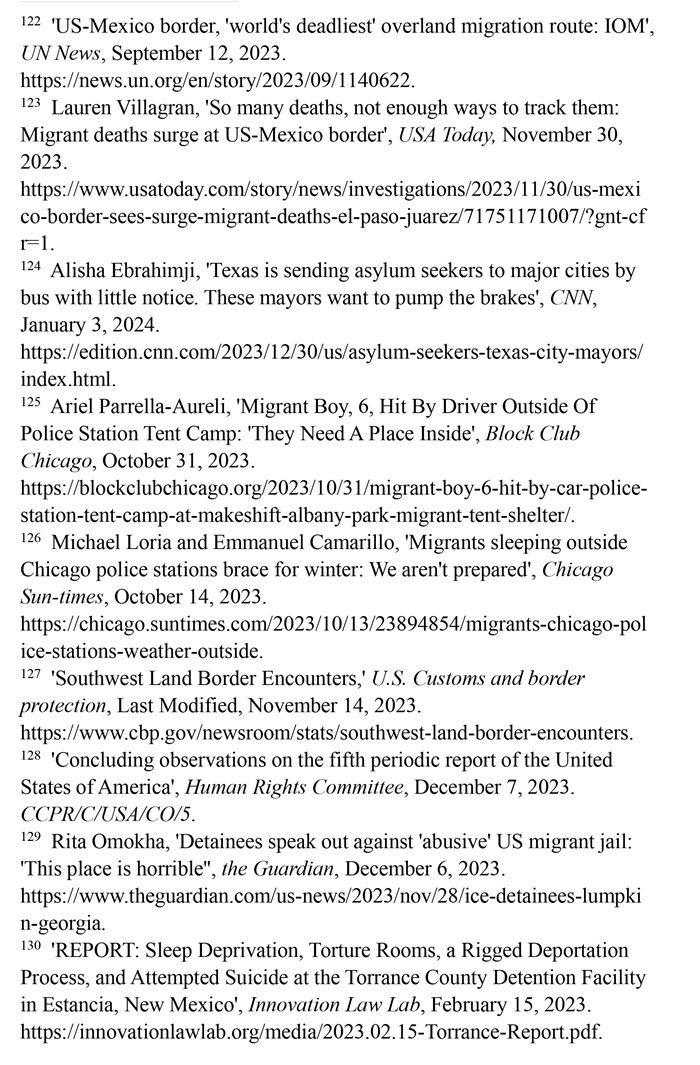 入境移民遭受酷刑及其他不人道待遇。2023財年,在美國南部邊境遭逮捕或驅逐的移民總數(shù)達240多萬人,再創(chuàng)歷史新高。(注127)聯(lián)合國人權事務委員會對移民在美國受到長時間的拘留表示擔憂,批評美國的拘留所條件惡劣,人滿為患,被拘押者無法獲得食物、水和醫(yī)療服務,導致包括兒童在內的許多人死亡;公共和私營移民拘留設施存在性暴力、長期單獨監(jiān)禁、虐待等侵犯人權問題。(注128)英國《衛(wèi)報》網(wǎng)站2023年12月6日報道,由美國私人監(jiān)獄公司CoreCivic運營的、位于佐治亞州蘭普金的斯圖爾特拘留中心存在長期單獨監(jiān)禁、性虐待、醫(yī)療疏忽以及強迫勞動等令人擔憂的問題。(注129)創(chuàng)新法律實驗室于2023年2月15日發(fā)布報告揭露,由CoreCivic運營的、位于新墨西哥州埃斯坦西亞的托蘭斯縣拘留所存在對被關押者實施酷刑現(xiàn)象。在夜間,每隔15分鐘就會有一名警衛(wèi)開著收音機的最大音量走過這些房間,大聲地敲著門,并用手電筒強光照進房間,吵醒任何可能睡著的人。在寒冷的天氣里,每個房間的通風管道整夜都在吹冷空氣。一些人試圖用衛(wèi)生紙或毯子蓋住通風口,但警衛(wèi)們拿走了用來阻擋冷空氣的任何東西。這些牢房里,廁所污水和糞便溢出,人們被迫睡在臭氣熏天的地板上。(注130)