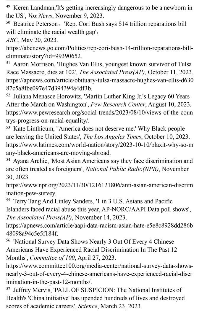 對非洲裔種族迫害的賠償遙遙無期。美國南北戰(zhàn)爭結束不久后,美國政府承諾向曾被奴役的每一個非洲裔家庭進行賠償,但一百多年來這一承諾從未兌現(xiàn)。1989年,美國眾議院非洲裔議員約翰·科尼爾斯提出“研究和制定非洲裔美國人賠償提案委員會法案”(H.R.40法案),但這一法案數(shù)十年來從未進入過國會表決程序。(注50)1921年,美國俄克拉何馬州塔爾薩地區(qū)發(fā)生針對非洲裔的種族屠殺事件,導致數(shù)百人遇害。為塔爾薩大屠殺最后3位已知幸存者爭取賠償?shù)脑V訟仍未定案,而其中年齡最低的幸存者休斯·范·埃利斯已于2023年10月去世。(注51)皮尤研究中心2023年8月10日發(fā)表的報告顯示,83%的非洲裔美國人表示,美國政府所做的確保平等的努力還遠遠不夠。(注52)許多不滿美國政治和種族歧視的非洲裔選擇離開。離開美國的非洲裔在葡萄牙、加納、哥倫比亞和墨西哥等地建立了新的社區(qū),這已然成為一種名為“Blaxit”的潮流(“Black”和“exit”的結合),并在社交媒體上廣泛流傳。他們高呼:“美國配不上我!”(注53)