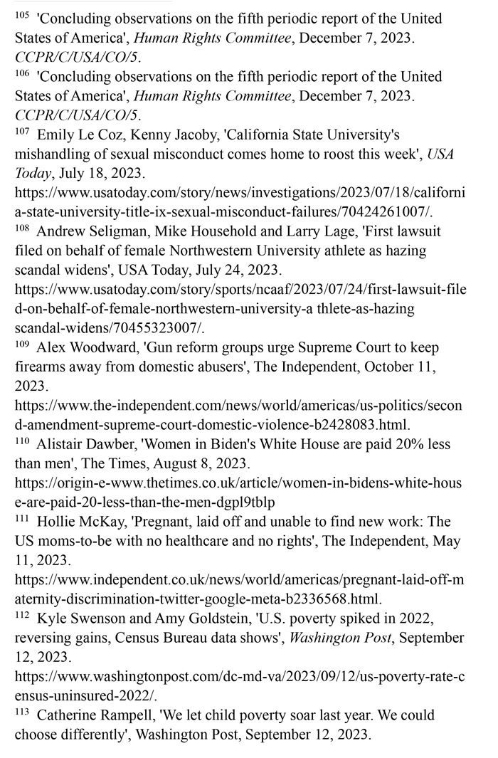 多領域存在針對婦女的暴力侵害。聯(lián)合國人權事務委員會指出,在美國,包括家庭暴力和性暴力在內的暴力侵害婦女行為持續(xù)存在。美國的學校和高等教育機構以及武裝部隊中普遍存在針對婦女和女童的性暴力。(注106)對美國最大的公立大學加利福尼亞州立大學的調查顯示,該校23個校區(qū)普遍存在對性暴力的縱容。該校行政人員對收到的性侵指控大多不予調查;在少數(shù)予以調查的案件中,即使發(fā)現(xiàn)被告有錯,也不采取行動。2018年至2022年,該校至少1251名員工受到性騷擾指控,只有254宗得到調查。(注107)西北大學的排球、足球、壘球、棒球等運動項目中不斷爆出性侵丑聞,舉報者稱在這些項目中性虐待和種族歧視非常猖獗。(注108)美國聯(lián)邦調查局發(fā)布的數(shù)據(jù)顯示,每年有600多名美國女性被親密伴侶槍殺,大約每14小時就有一人被槍殺。(注109)