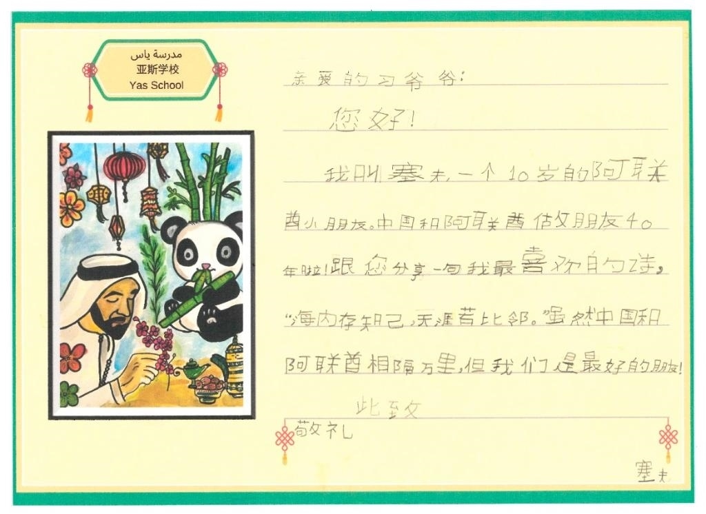 10歲的塞夫就讀于阿聯(lián)酋規(guī)模最大的公立學(xué)校亞斯學(xué)校。他在信中與習(xí)爺爺分享自己最喜歡的一句中國(guó)古詩(shī)——“海內(nèi)存知己,天涯若比鄰”,因?yàn)椤半m然中國(guó)和阿聯(lián)酋相隔萬(wàn)里,但我們是最好的朋友!”