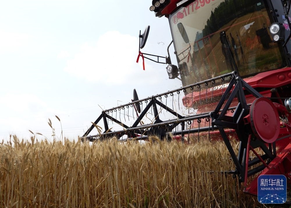 5月26日,農(nóng)民駕駛收割機(jī)在河南省寶豐縣鬧店鎮(zhèn)鬧店村麥田里收割小麥。新華社發(fā)(何五昌攝)
