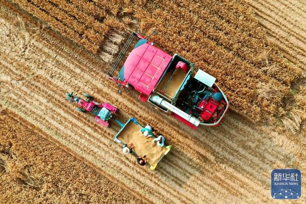 5月24日,河南省駐馬店市正陽(yáng)縣王勿橋鄉(xiāng)謝莊村村民在搶收小麥(無(wú)人機(jī)照片)。新華社發(fā)(高萬(wàn)寶攝)