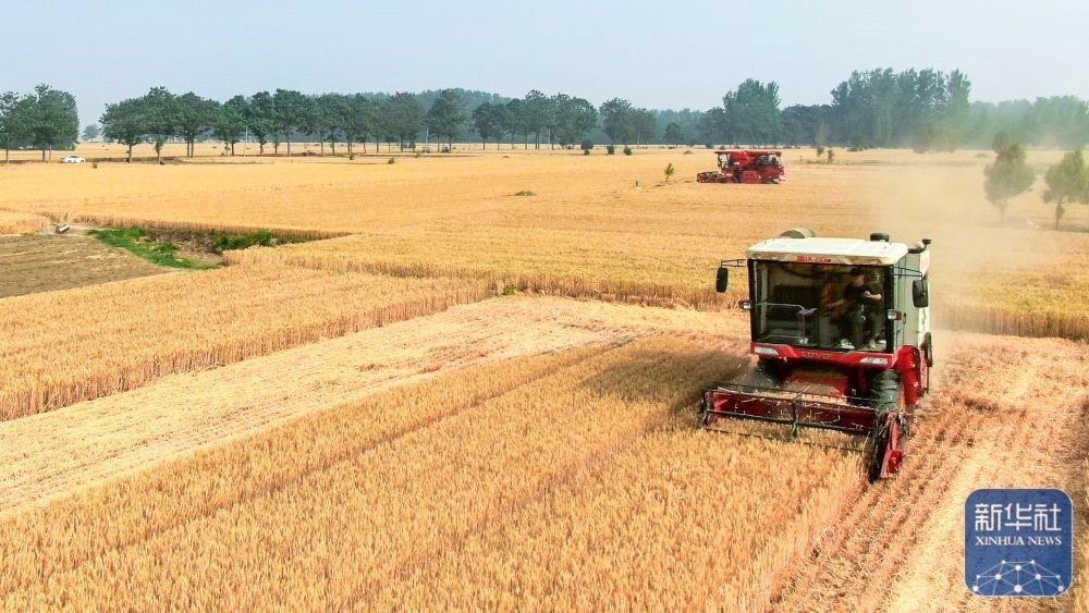 5月25日,在河南省駐馬店市汝南縣三橋鎮(zhèn)殷店村,收割機(jī)、秸稈摟草機(jī)在麥地里穿梭作業(yè)。新華社發(fā)(張萌攝)