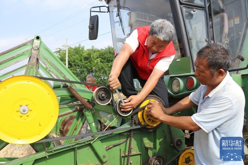 5月26日,在河南省南陽(yáng)市內(nèi)鄉(xiāng)縣大橋鄉(xiāng),農(nóng)機(jī)服務(wù)人員(右二)為跨區(qū)作業(yè)的農(nóng)機(jī)手提供免費(fèi)機(jī)修服務(wù)。新華社發(fā)(張中立攝)