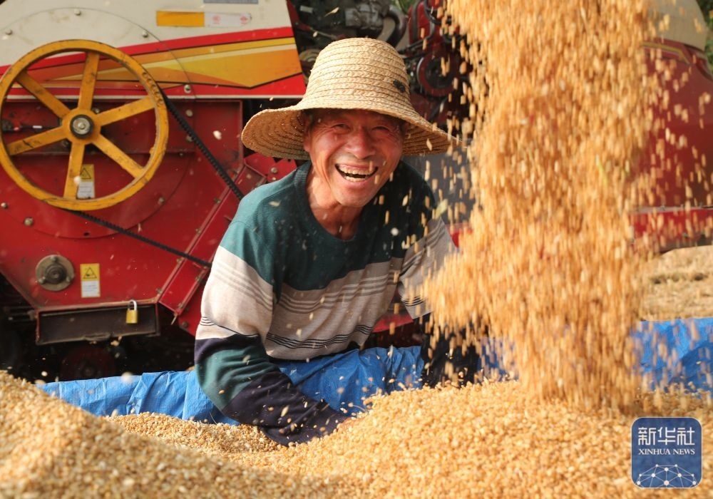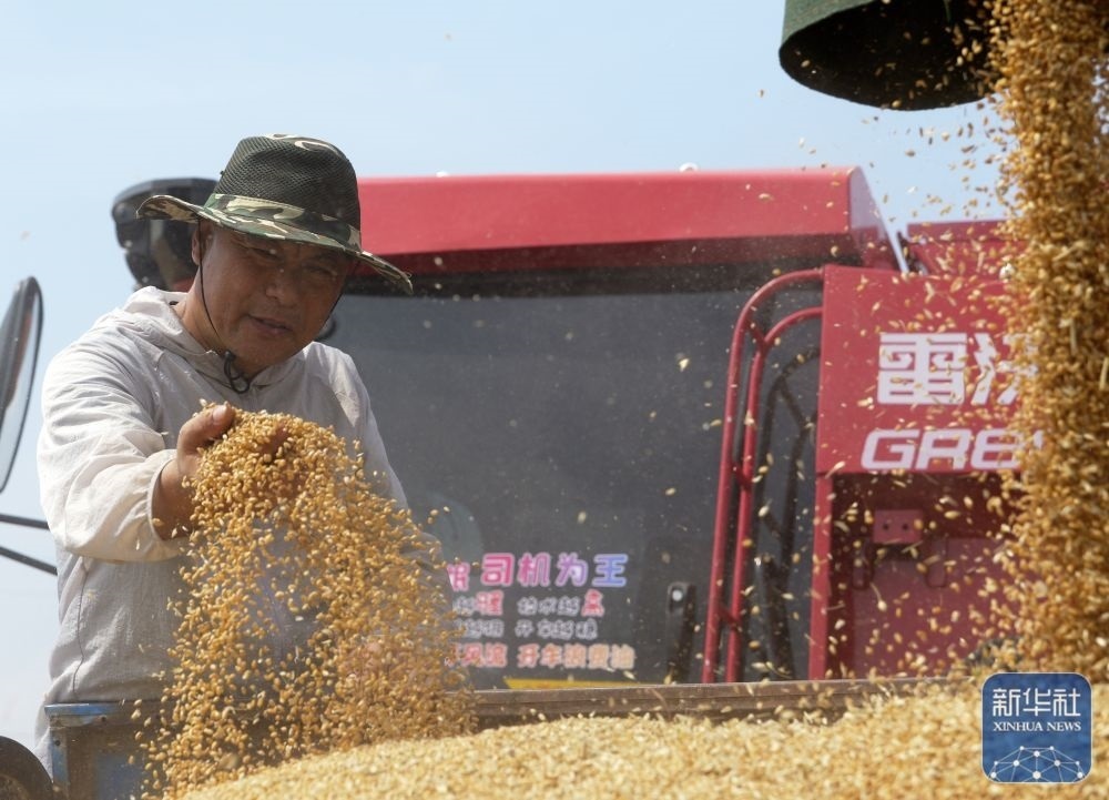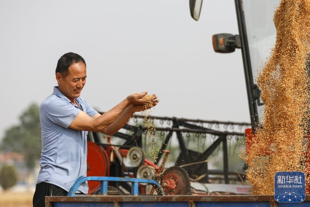 5月26日,河南省開(kāi)封市尉氏縣邢莊鄉(xiāng)北丁莊村村民丁雙喜在收獲小麥。新華社發(fā)(李新義攝)