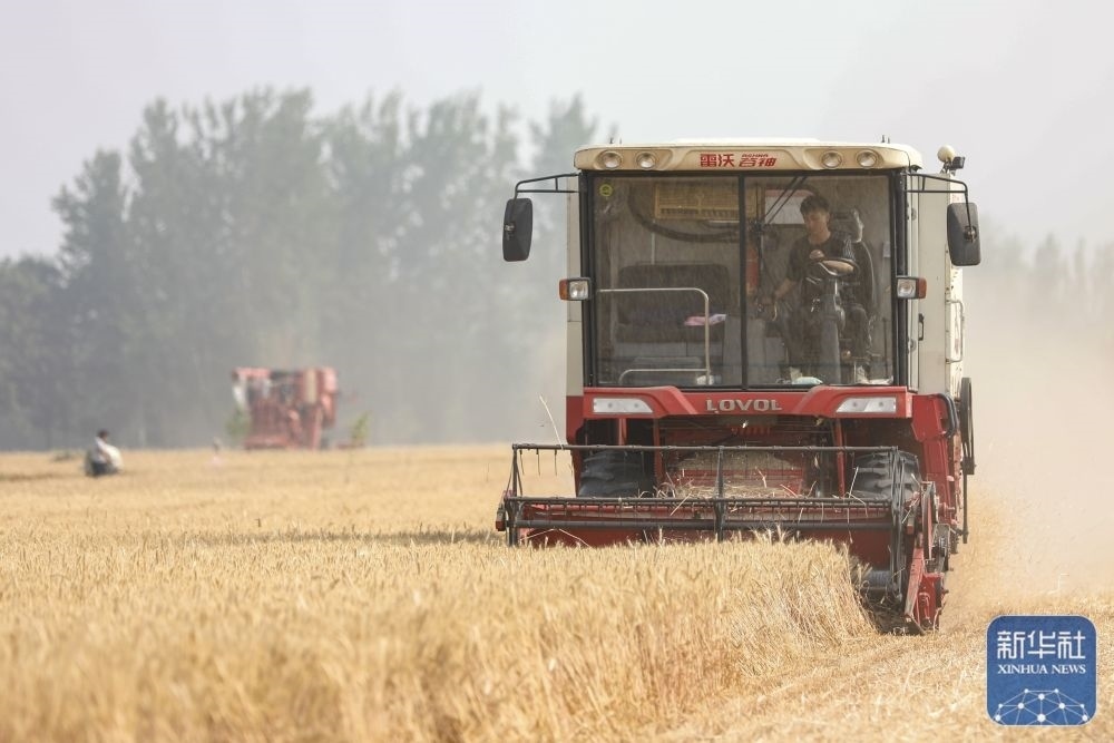5月26日,在河南省商丘市睢縣尚屯鎮(zhèn)荒莊村,農(nóng)民駕駛收割機(jī)搶收小麥。新華社發(fā)(徐澤源攝)