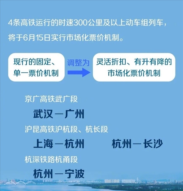 ·6月1日開售實(shí)行市場(chǎng)化票價(jià)機(jī)制的4條高鐵車票,最低55折。
