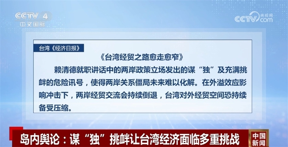 央視網(wǎng)消息:雖然島內(nèi)有關(guān)機(jī)構(gòu)預(yù)測今年臺灣經(jīng)濟(jì)增長率可達(dá)3%,但賴清德“5·20演說”卻傳遞出謀“獨(dú)”挑釁的危險信號。對此,島內(nèi)輿論和有關(guān)人士普遍擔(dān)心,臺海形勢緊張動蕩讓臺灣經(jīng)濟(jì)發(fā)展前景“烏云密布”。