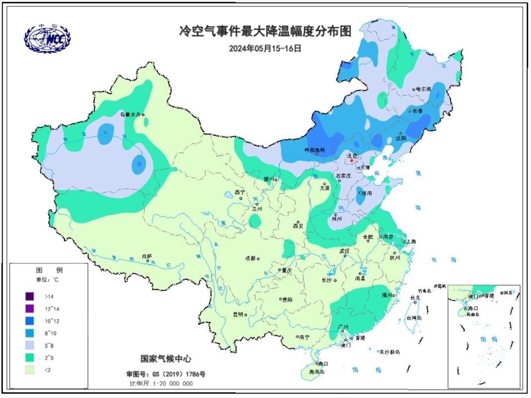 圖8 2024年5月15-16日全國最大降溫幅度分布圖