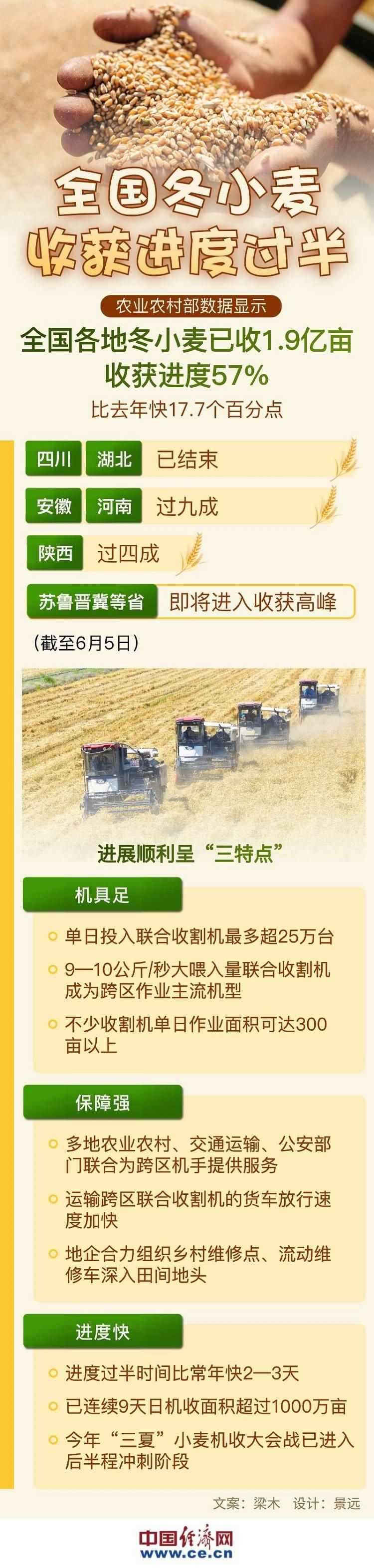 中國經(jīng)濟網(wǎng)6月6日訊 (記者 梁木) 當(dāng)前,冬小麥機收正由南向北加快推進。截至6月5日,全國各地冬小麥已收1.9億畝、收獲進度57%,比去年快17.7個百分點。四川、湖北麥?zhǔn)找呀Y(jié)束,安徽、河南進度過九成,陜西過四成,蘇魯晉冀等省即將進入收獲高峰。