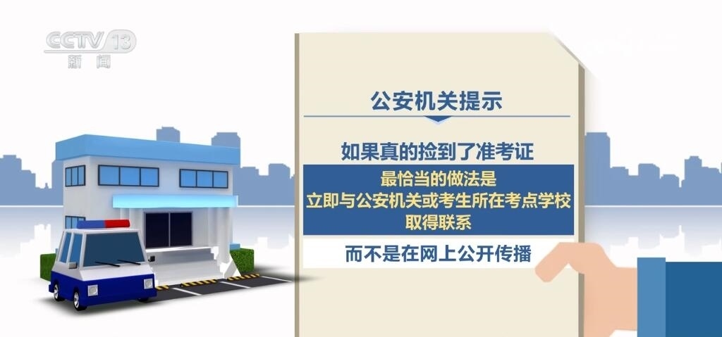 公安機(jī)關(guān)提示:如果真的撿到了準(zhǔn)考證,最恰當(dāng)?shù)淖龇ㄊ橇⒓磁c公安機(jī)關(guān)或考生所在考點(diǎn)學(xué)校取得聯(lián)系,而不是在網(wǎng)上公開傳播。另外,如果看到此類信息的網(wǎng)友,未經(jīng)核實(shí)的情況下不轉(zhuǎn)發(fā)、不跟貼、不評論,不撥打相關(guān)聯(lián)系電話,謹(jǐn)防上當(dāng)受騙。