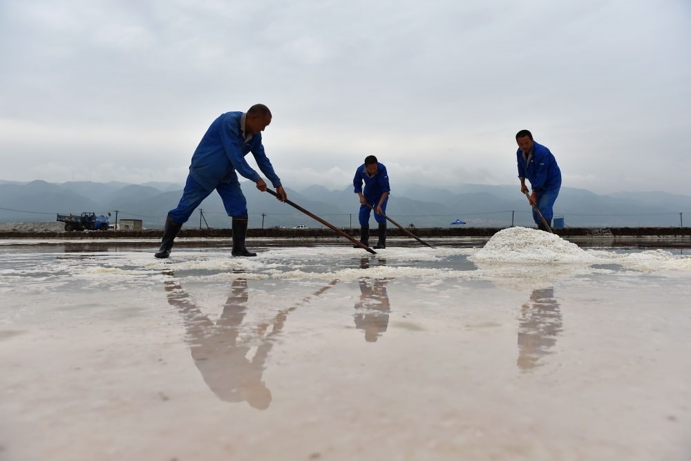 2016年8月25日,工人在運城鹽湖進行扒鹽作業(yè)。