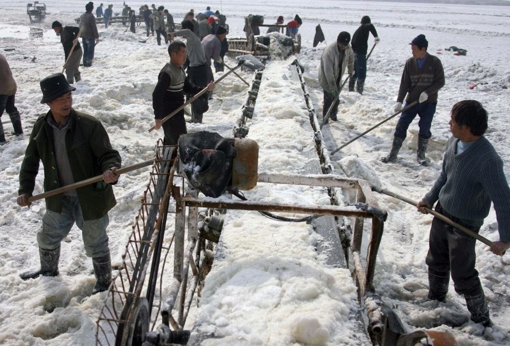 2009年2月11日,鏟硝工人在運城鹽湖鏟收芒硝。