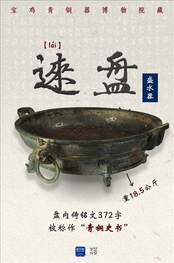 這件青銅器是被稱(chēng)作“青銅史書(shū)”的逨盤(pán)。盤(pán)內(nèi)鑄銘文372字,完整記錄了單氏家族八代人輔佐西周12位周王征戰(zhàn)、理政、管治林澤的重要史事。從銘文中可看出,周人將家族命運(yùn)和國(guó)家命運(yùn)緊密結(jié)合,也是后來(lái)儒家“修身、齊家、治國(guó)、平天下”的思想基礎(chǔ)。