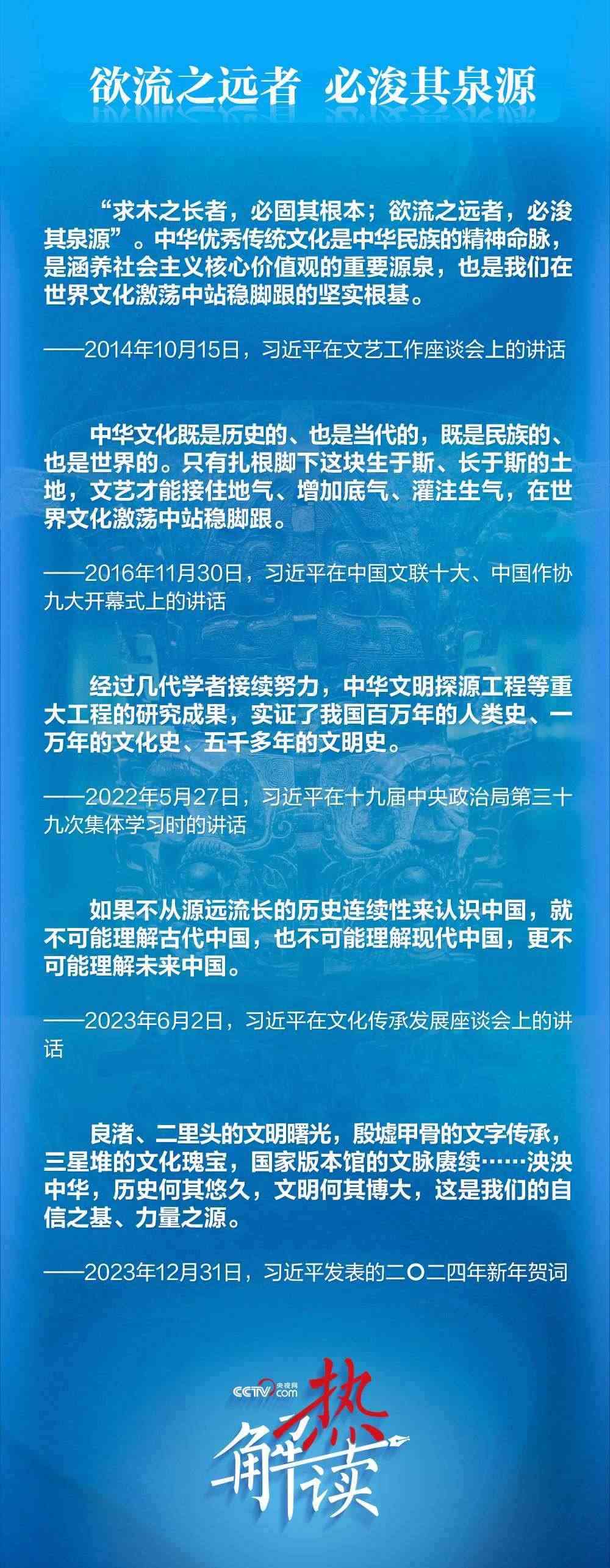 一件件文物、一處處文化古跡、一項(xiàng)項(xiàng)文化藝術(shù),串連起中華民族的文化史,蘊(yùn)藏著“何以中國(guó)”的文化力量??倳?shū)記對(duì)中華文明之源的關(guān)注,彰顯的正是他對(duì)推動(dòng)文化繁榮、建設(shè)文化強(qiáng)國(guó)的深刻思考和文化自信。