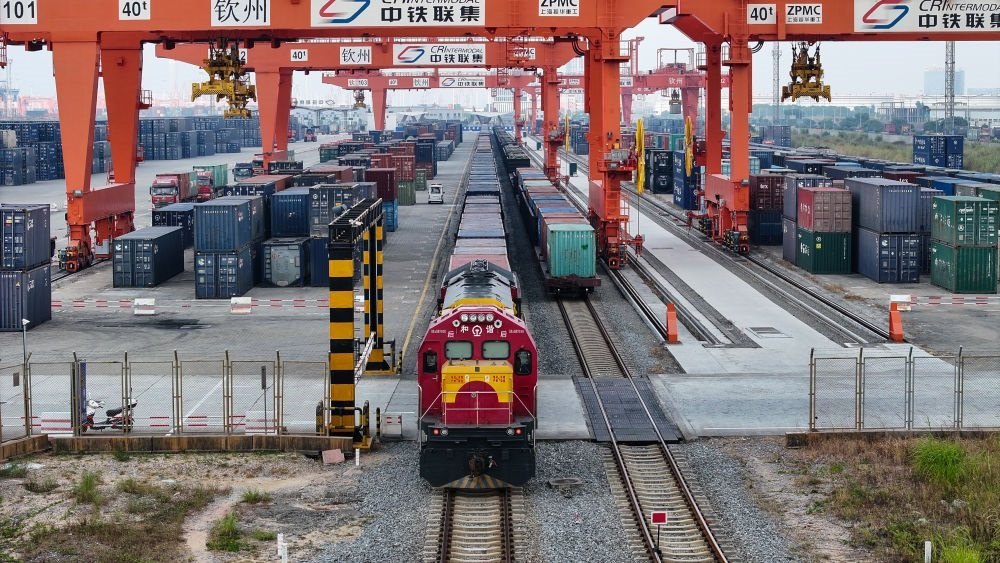 西部陸海新通道鐵海聯(lián)運班列從欽州港東站駛出(2024年5月12日攝,無人機照片)。隨著中國-東盟開放平臺建設(shè)向縱深推進,西部陸海新通道正在成為釋放開放活力的強力新引擎,以物流為切入口,促進資金、資源、人員、技術(shù)等生產(chǎn)要素深度融合。
