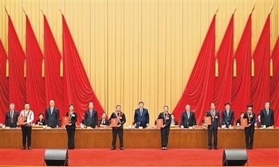 在歡快的樂曲聲中,習(xí)近平等為受表彰的模范個(gè)人和模范集體代表頒獎(jiǎng)。