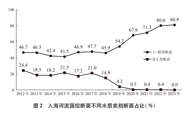 抓好入海河流污染防治。入海河流是陸源污染物輸入海洋的最重要途徑。中國(guó)積極提升城鎮(zhèn)污水處理質(zhì)效,建設(shè)改造雨污分流管網(wǎng),加強(qiáng)污水處理行業(yè)監(jiān)管,降低城鎮(zhèn)生產(chǎn)生活污水對(duì)入海河流水質(zhì)影響。2012年以來(lái),沿海地區(qū)污水處理基礎(chǔ)設(shè)施建設(shè)顯著提速,地級(jí)以上城市污水處理廠基本完成一級(jí)A提標(biāo)改造。開展農(nóng)村環(huán)境整治,“十四五”以來(lái),沿海省份新增完成1.7萬(wàn)個(gè)行政村環(huán)境綜合整治,編制完成170個(gè)畜牧大縣畜禽養(yǎng)殖污染防治規(guī)劃,農(nóng)村生活污水治理率超過(guò)45%,大幅降低農(nóng)業(yè)農(nóng)村污水排放。著力破解流域氮排放過(guò)量的近岸海域水質(zhì)污染和富營(yíng)養(yǎng)化問(wèn)題,建立沿海、流域、海域協(xié)同一體的綜合治理體系,探索將總氮控制范圍向入海河流上游拓展,推動(dòng)入海河流實(shí)施“一河一策”總氮治理。2012-2017年中國(guó)入海河流國(guó)控?cái)嗝嫠|(zhì)整體保持穩(wěn)定并有所好轉(zhuǎn),2018年以后水質(zhì)整體大幅好轉(zhuǎn)。目前,入海河流國(guó)控?cái)嗝嫠|(zhì)優(yōu)良(Ⅰ~Ⅲ類)斷面數(shù)量約占整體的五分之四左右,喪失使用功能(劣Ⅴ類)斷面基本消除。