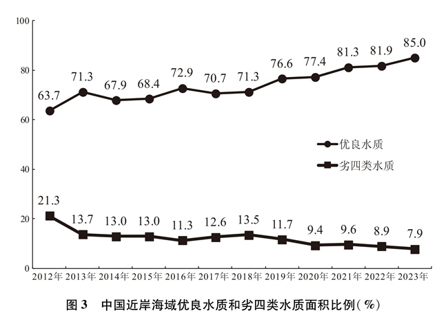 通過(guò)深入推進(jìn)重點(diǎn)海域綜合治理、陸海污染協(xié)同防治,持續(xù)建設(shè)美麗海灣,中國(guó)近岸海域水質(zhì)總體改善,2023年優(yōu)良水質(zhì)面積比例較2012年高出21.3個(gè)百分點(diǎn)。
