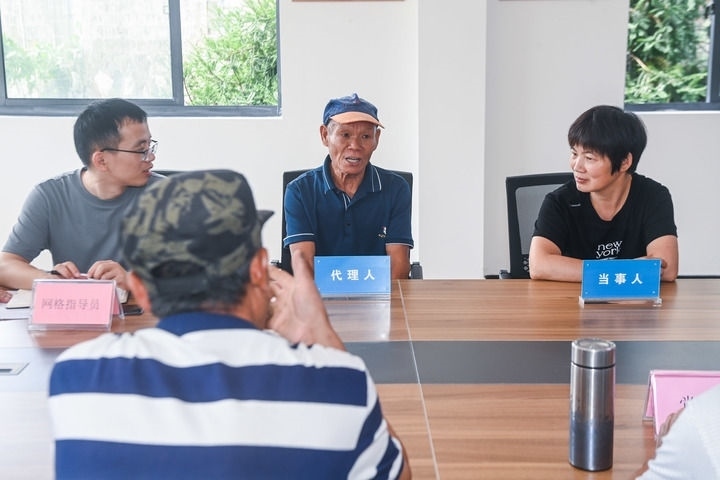 2023年7月26日,在浙江省諸暨市東白湖鎮(zhèn)婁東村新時代文明實踐站的文明共富會客廳內(nèi),網(wǎng)格長召集村里矛盾雙方當(dāng)事人以及黨員代表、鄉(xiāng)賢代表、人大代表等成員進行宅基地指標(biāo)糾紛的現(xiàn)場調(diào)解。新華社記者 徐昱 攝