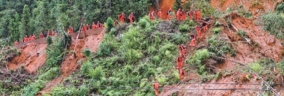 湖南省郴州市資興市八面山瑤族鄉(xiāng),消防救援人員穿越山體滑坡路段,徒步前往受災(zāi)地區(qū)。李 科攝(人民視覺)