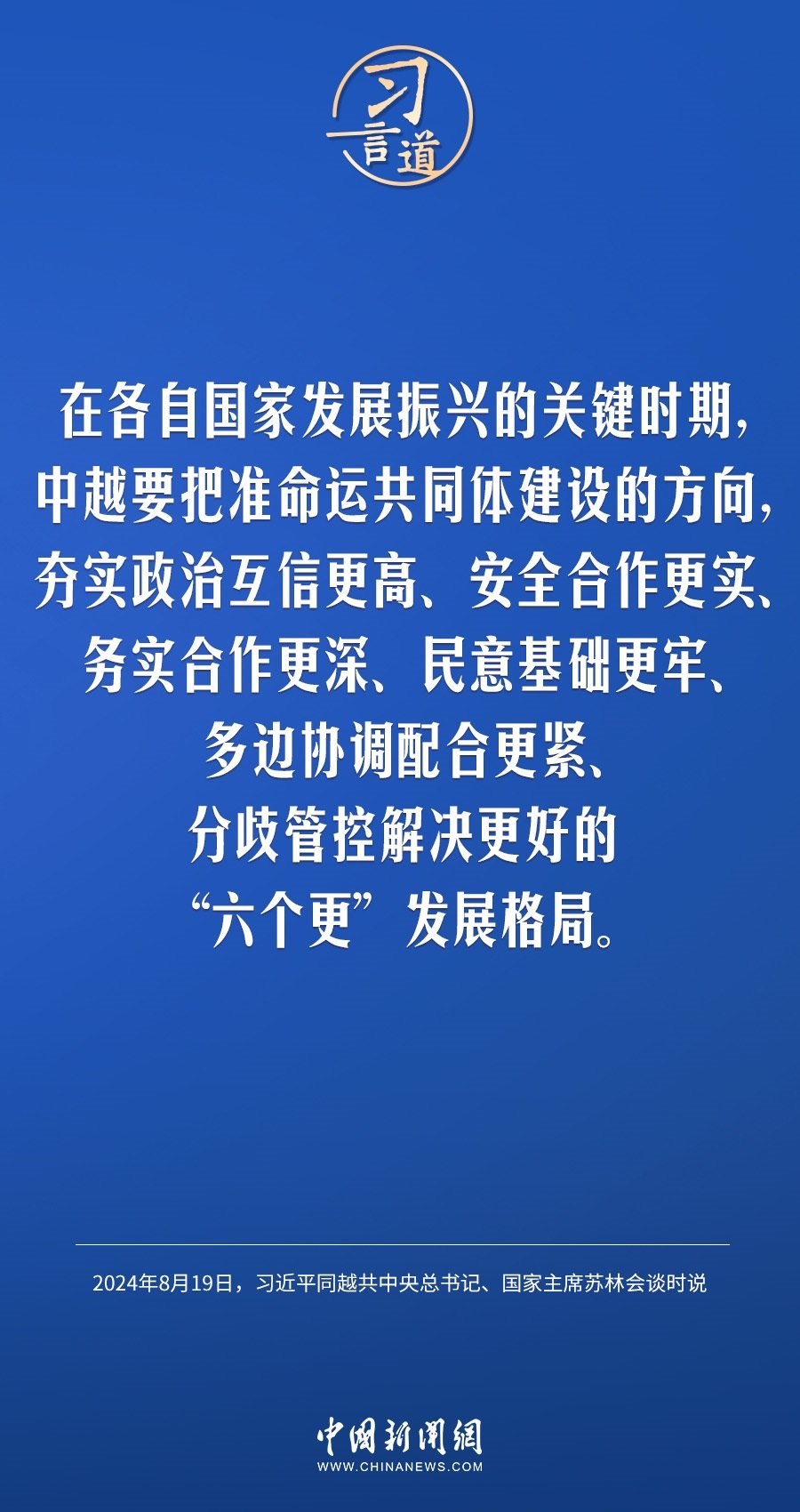 8月19日,中共中央總書記、國(guó)家主席習(xí)近平在北京人民大會(huì)堂同來(lái)華進(jìn)行國(guó)事訪問(wèn)的越共中央總書記、國(guó)家主席蘇林舉行會(huì)談。習(xí)近平指出——