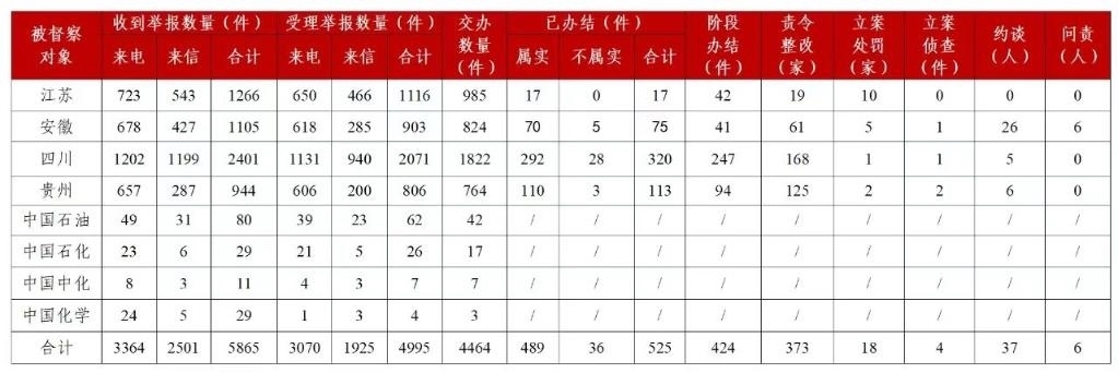 截至10月30日20時,各督察組共收到群眾來電、來信舉報5865件,受理有效舉報4995件,經梳理合并重復舉報,累計向被督察對象轉辦4464件。被督察對象已辦結或階段辦結949件,其中立案處罰18家;立案偵查4件;約談黨政領導干部37人,問責黨政領導干部6人。