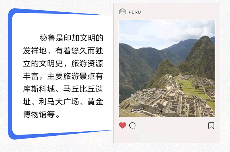 中國和秘魯都是文明古國,兩國友誼源遠流長,人民友好深入人心。習近平主席曾以“秘魯是中國在太平洋對岸的‘鄰居’”形容中秘關(guān)系,生動詮釋了兩國和兩國人民之間“相知無遠近”的深厚友誼。