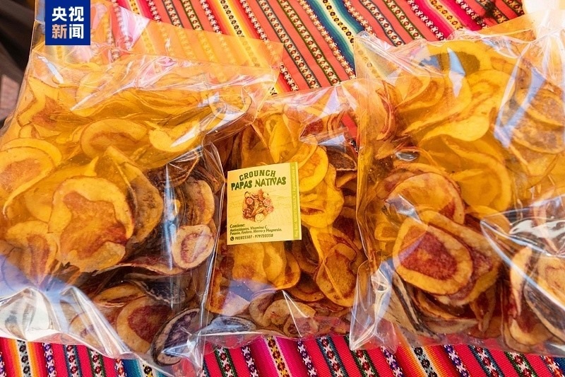 △今年5月30日,秘魯慶祝首個(gè)“國際馬鈴薯日”。當(dāng)?shù)匾粋€(gè)街頭市場上,展示著用馬鈴薯制成的薯片。
