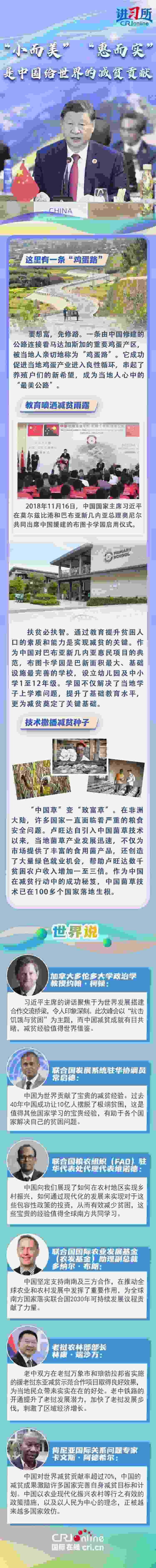 “世界繁榮穩(wěn)定不可能建立在貧者愈貧、富者愈富的基礎(chǔ)之上?!苯陙?lái),中國(guó)一直在用實(shí)際行動(dòng)與世界分享脫貧經(jīng)驗(yàn):與東盟國(guó)家共同開展鄉(xiāng)村減貧推進(jìn)計(jì)劃,在非洲開展基礎(chǔ)設(shè)施建設(shè)和農(nóng)業(yè)、醫(yī)療等技術(shù)合作援助項(xiàng)目,在拉美援建農(nóng)業(yè)技術(shù)中心......一批批“小而美”“惠而實(shí)”的民生項(xiàng)目落地生根,幫助當(dāng)?shù)孛癖姅[脫貧困。多國(guó)人士表示,中國(guó)成功打贏脫貧攻堅(jiān)戰(zhàn)具有世界意義,不僅為發(fā)展中國(guó)家提供了借鑒經(jīng)驗(yàn),更有助于推動(dòng)建設(shè)一個(gè)共同發(fā)展的公正世界。