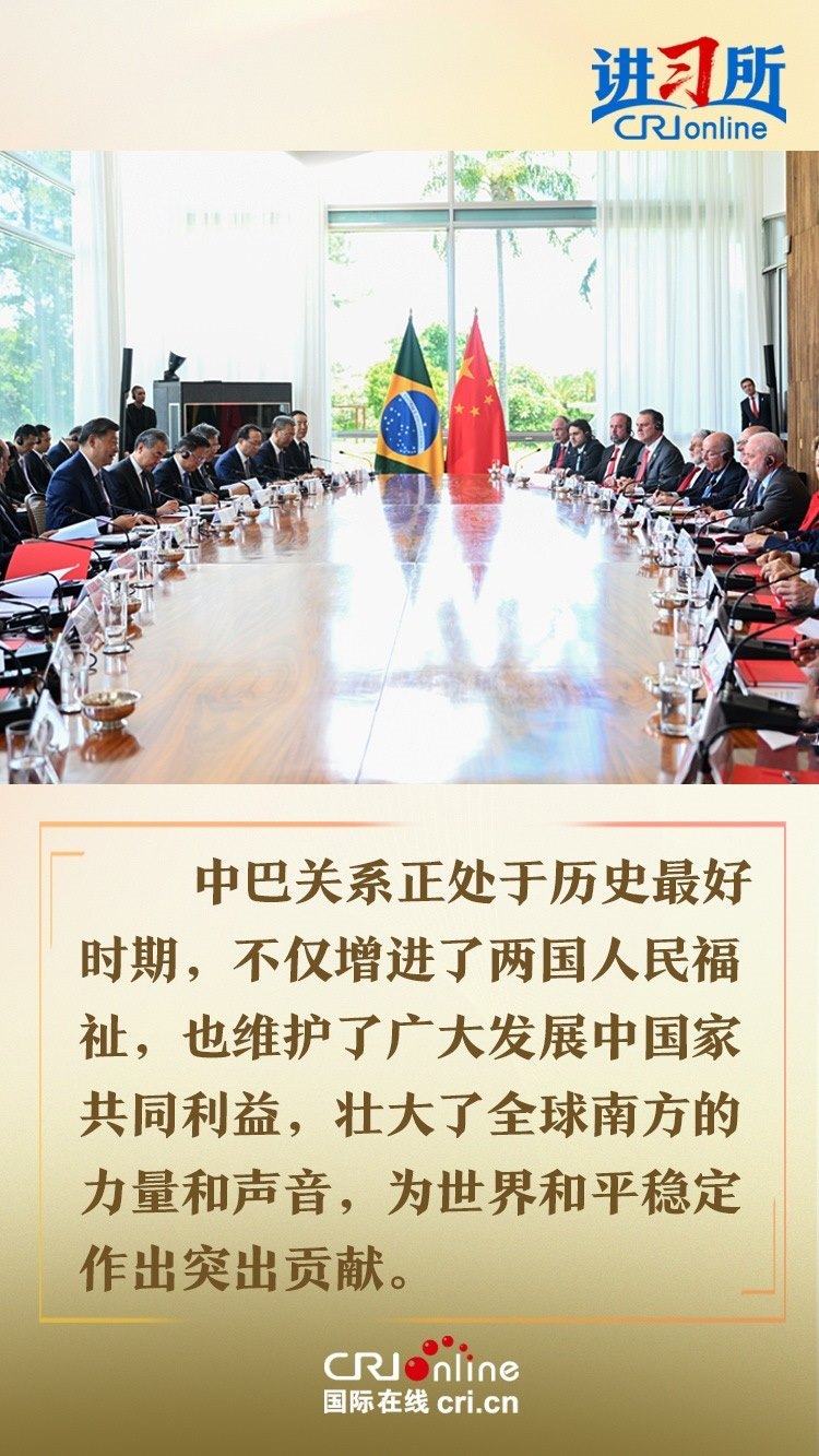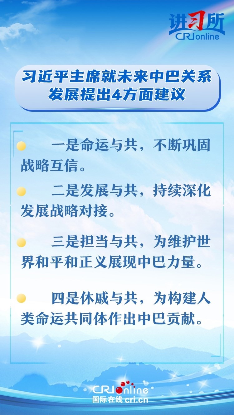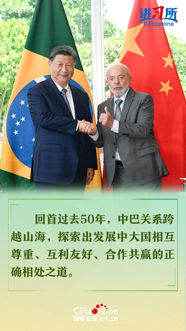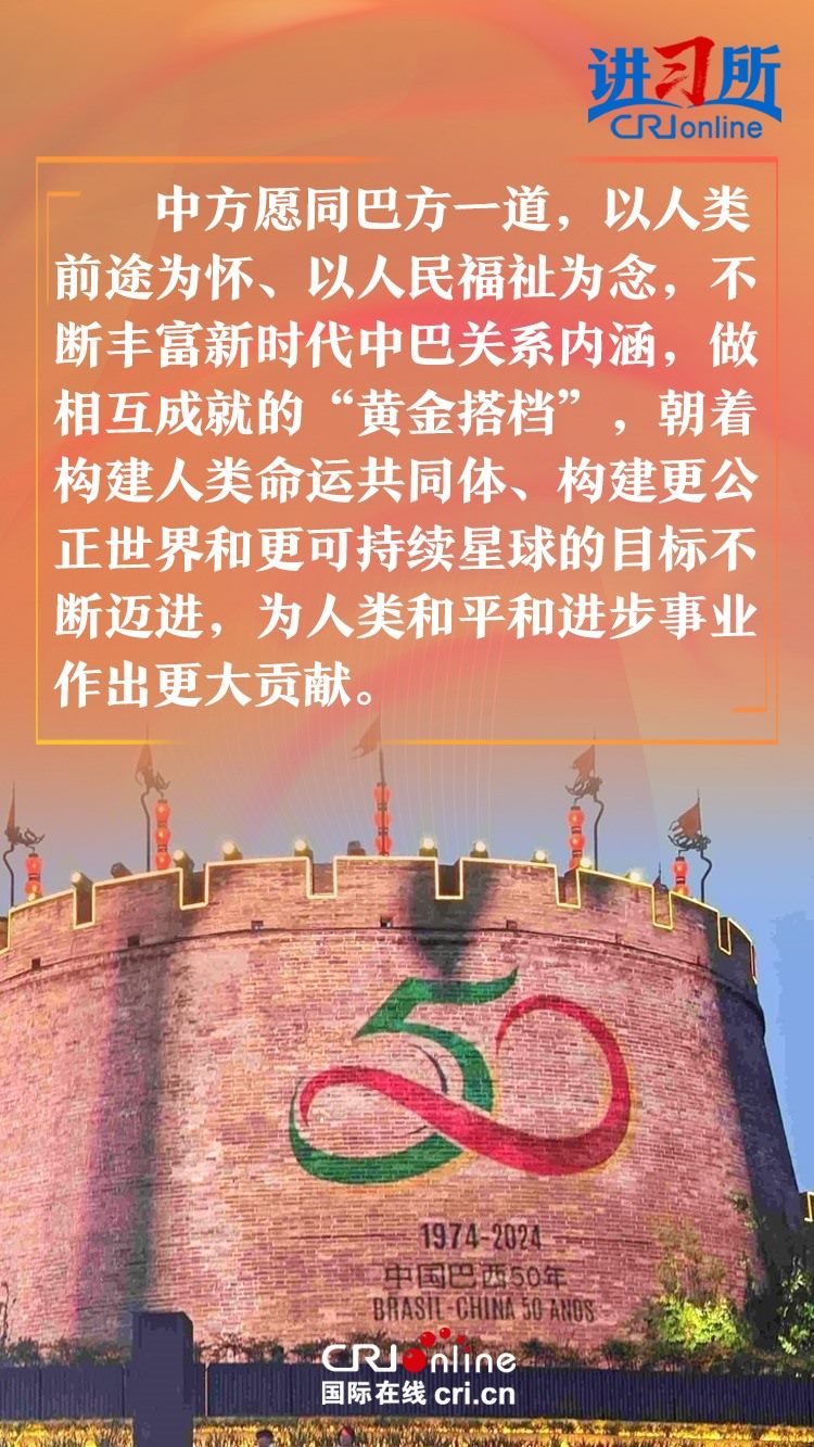 今年是中巴建交50周年。習(xí)近平指出,回首過去50年,中巴關(guān)系跨越山海,探索出發(fā)展中大國相互尊重、互利友好、合作共贏的正確相處之道。中方愿同巴方一道,以人類前途為懷、以人民福祉為念,不斷豐富新時代中巴關(guān)系內(nèi)涵,做相互成就的“黃金搭檔”,朝著構(gòu)建人類命運(yùn)共同體、構(gòu)建更公正世界和更可持續(xù)星球的目標(biāo)不斷邁進(jìn),為人類和平和進(jìn)步事業(yè)作出更大貢獻(xiàn)。