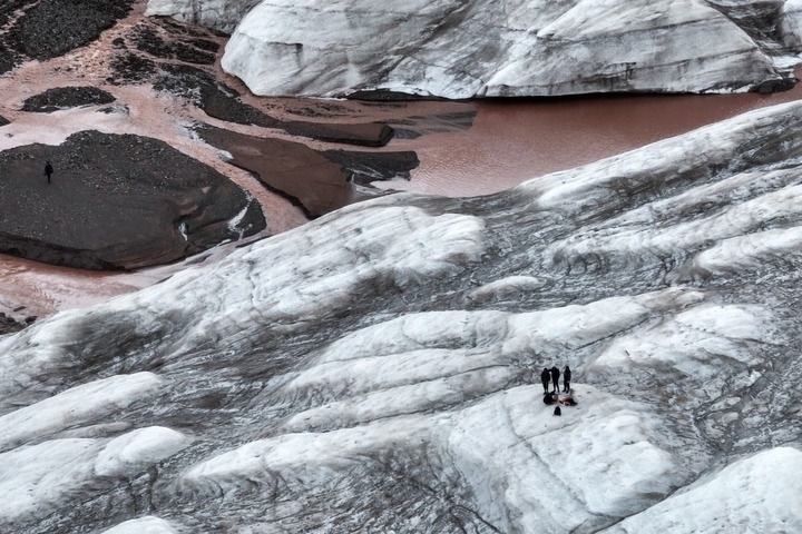 2024年7月25日,在青海省三江源區(qū)冬克瑪?shù)妆?,江源綜合科學(xué)考察隊(duì)員在探測冰川。新華社記者 伍志尊 攝