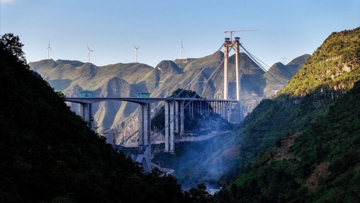 2024年9月3日,建設(shè)中的貴州花江峽谷大橋。大橋因跨越被稱為“地球裂縫”的花江大峽谷而得名,2025年建成后將成為世界第一高橋。新華社記者歐東衢攝