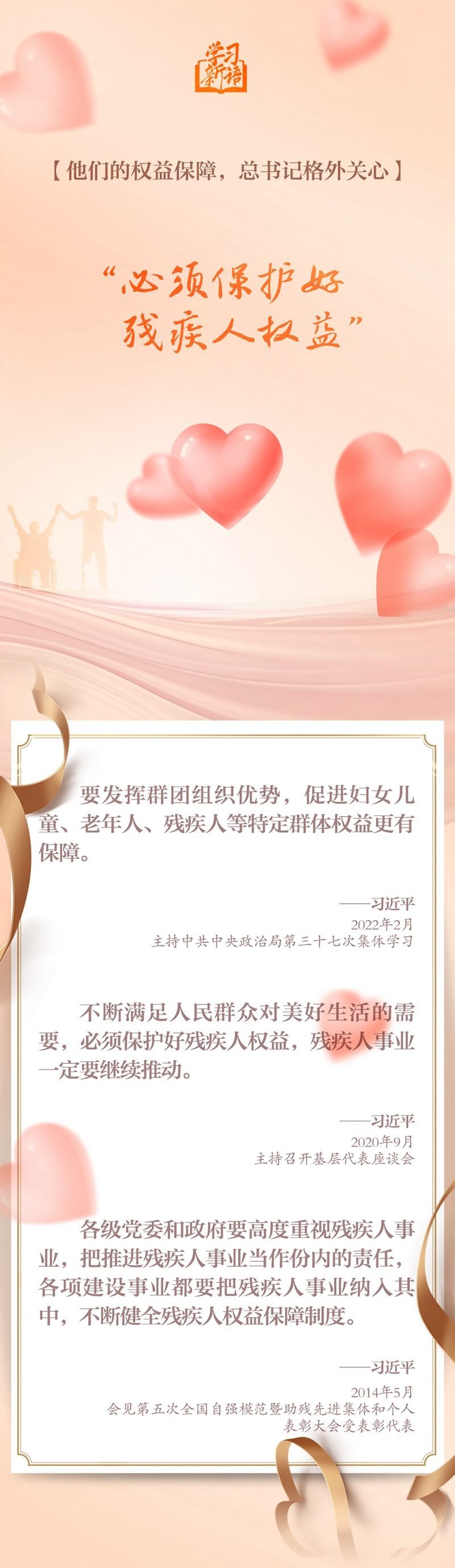 我國(guó)有8500萬(wàn)殘疾人。在習(xí)近平總書記心中,殘疾人是一個(gè)特殊困難的群體,需要格外關(guān)心、格外關(guān)注??倳浀囊痪渚錅嘏捳Z(yǔ)、一次次深情囑托,讓廣大殘疾人心田滋潤(rùn)、滿懷希望。