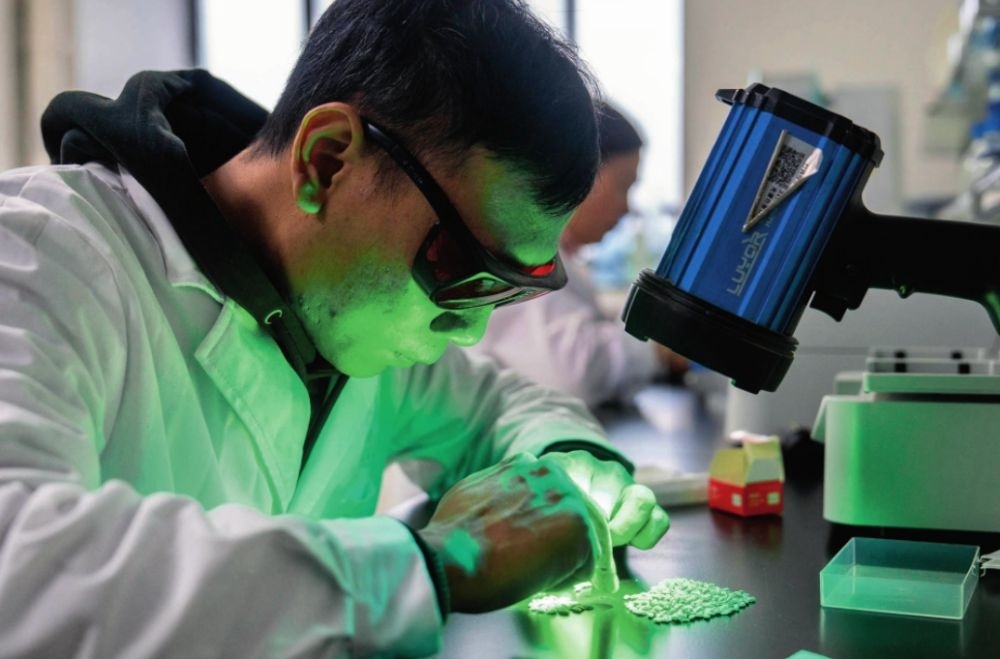 在湖南雜交水稻研究中心,工作人員通過(guò)熒光法進(jìn)行水稻樣本分析(2024年11月25日攝)。陳思汗攝/本刊