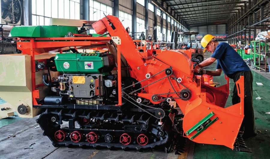 湖南省婁底市雙峰縣湖南湘源金穗智能裝備有限公司工人在組裝小型收割機(jī)(2024年9月11日攝)。陳思汗攝/本刊
